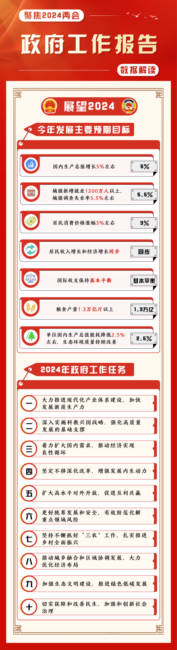 (制作:法治網(wǎng)輿情中心 數(shù)據(jù)來(lái)源:新華社微博:《一圖速覽2024年政府工作報(bào)告》;中國(guó)新聞網(wǎng):《事關(guān)你我!30句話讀懂政府工作報(bào)告》)