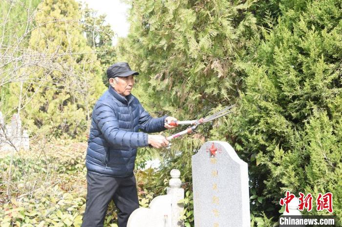 中新網(wǎng)徐州3月16日電 (朱志庚 譚曉立)“既然找不到烈士的家屬,那么我就是他們的親人,39年來逢年過節(jié)我都會代替他們家屬過來祭掃?!?月15日,江蘇省睢寧縣雙溝鎮(zhèn)紀灣村村民紀厚軍來到紀灣烈士陵園修剪松樹、綠植,為烈士墓碑描紅、擦拭。
