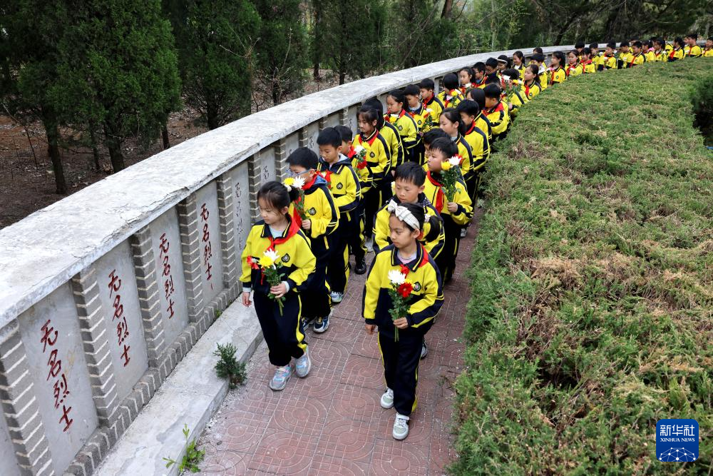 4月2日,山東省棗莊市文化路小學(xué)的學(xué)生在棗莊革命烈士陵園緬懷先烈。