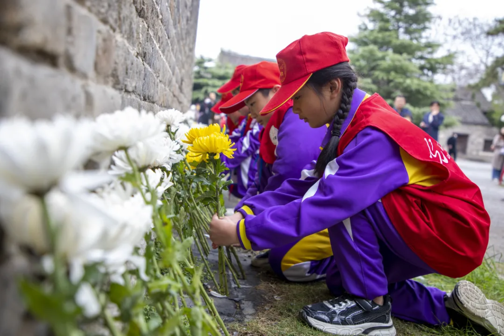 在山東棗莊臺(tái)兒莊古城,當(dāng)?shù)貙W(xué)生參加鮮花祭奠活動(dòng)。(受訪單位供圖)