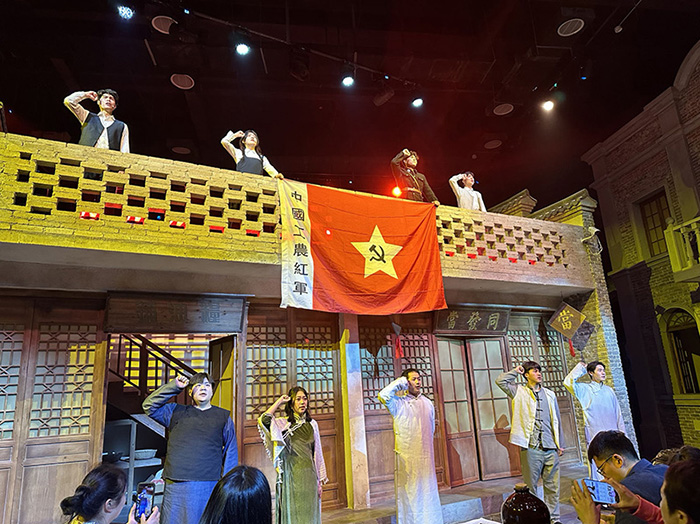 “十萬(wàn)劇場(chǎng)”打造了沉浸式、元宇宙、年輕化紅色演藝戲劇《立夏》,以1929年在金剛臺(tái)地區(qū)爆發(fā)的立夏節(jié)(商南)起義為原型,帶領(lǐng)觀眾穿越綿長(zhǎng)的時(shí)光隧道,身臨其境地感受當(dāng)時(shí)人民所受的沉重壓迫,體會(huì)革命者草長(zhǎng)鶯飛般的革命激情。