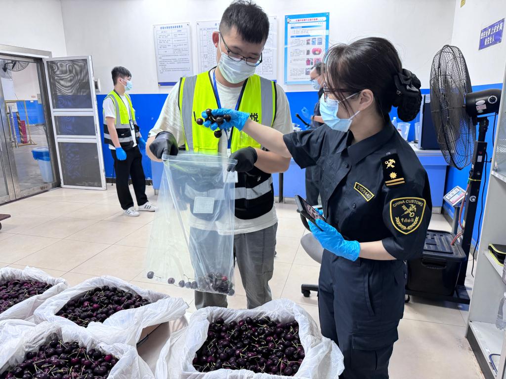 廣州白云機場海關關員對新產季進口車厘子進行監(jiān)管。(受訪者供圖)