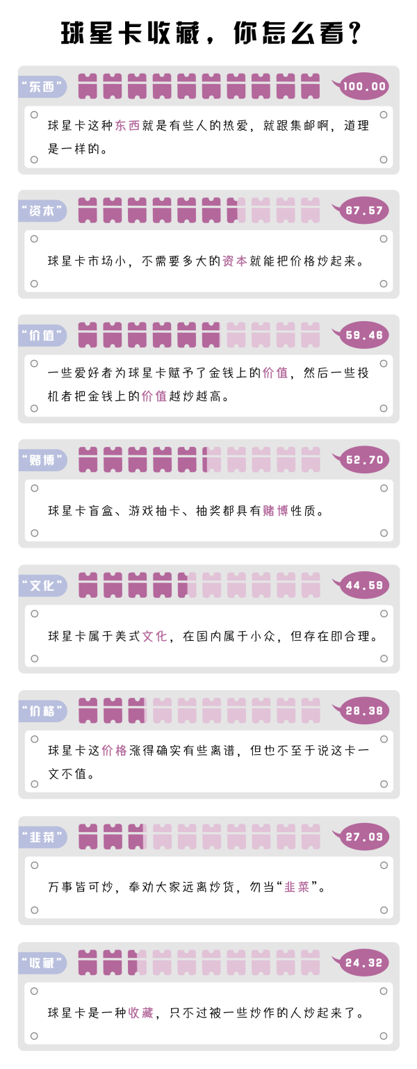 面對話題熱度與價(jià)值不斷攀升的球星卡,有的網(wǎng)友認(rèn)為球星卡收藏跟集郵是一個(gè)道理,熱愛無需理由,存在即合理;有的網(wǎng)友則表示,“天價(jià)”球星卡背后存在資本運(yùn)作,炒作球星卡已經(jīng)成為某些人的斂財(cái)手段;也有網(wǎng)友呼吁大家理性消費(fèi),勿盲目跟風(fēng)、投機(jī)倒把,別被市場當(dāng)成“韭菜”。