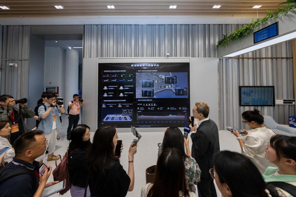 5月23日,大模型企業(yè)、智象未來(lái)生態(tài)合作部總經(jīng)理沈偉峰為采訪團(tuán)介紹運(yùn)用大模型文生視頻。新華社記者 王翔 攝