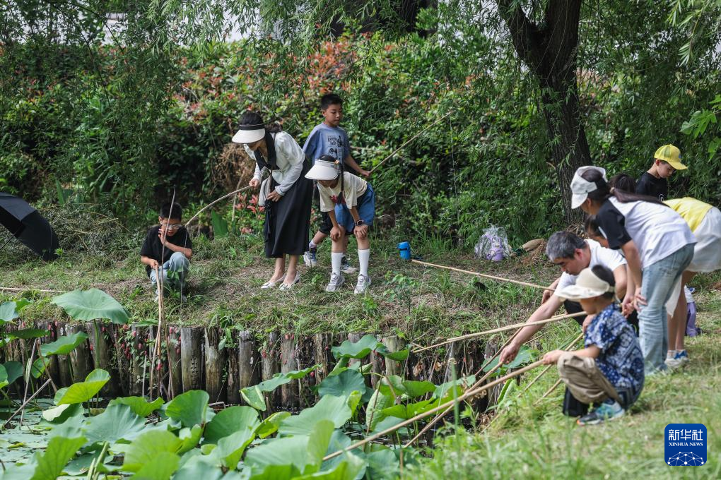 5月25日,在東林鎮(zhèn)泉益村活動(dòng)現(xiàn)場,孩子們?cè)诟改傅膸ьI(lǐng)下釣小龍蝦。
