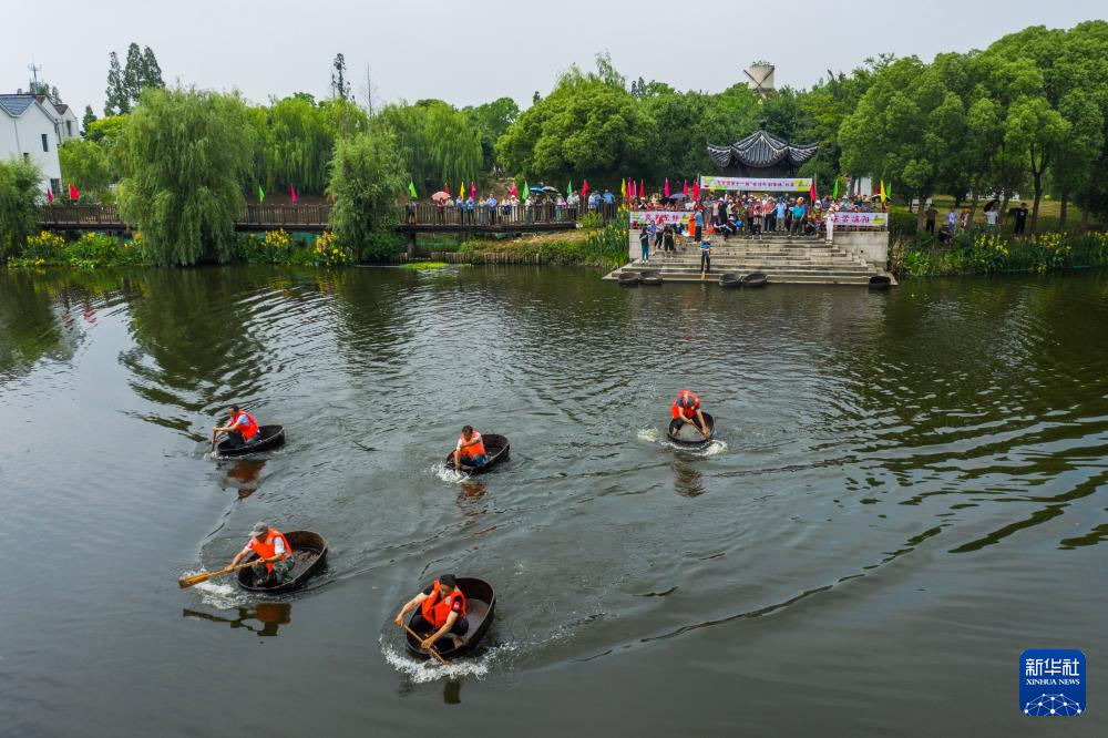 5月25日,村民們參加水鄉(xiāng)劃菱桶比賽。菱桶是河網(wǎng)密布的東林鎮(zhèn)百姓家中常見的一種傳統(tǒng)水上勞動工具,村民在捕魚、采菱、采荷時(shí)都要用到(無人機(jī)照片)。