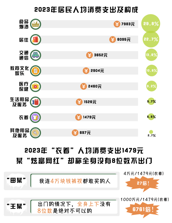 以上網(wǎng)紅炫耀的消費(fèi)能力遠(yuǎn)超普通居民的人均購(gòu)買力,成為過(guò)著“茶米油鹽醬醋茶”生活的工薪者們不可觸及的“夢(mèng)”。