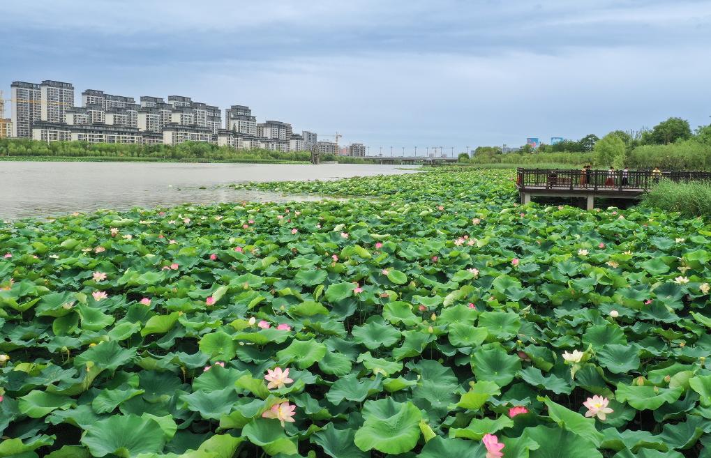 6月21日,陜西省富平縣石川河國家濕地公園內荷花盛開。新華社記者 李賀 攝