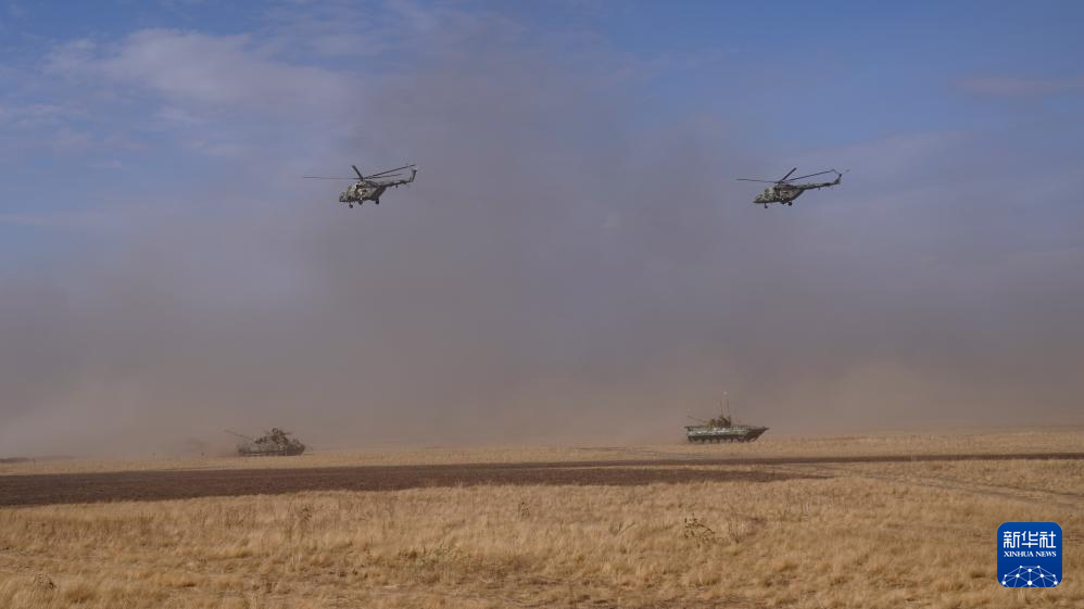 2021年9月23日,在俄羅斯奧倫堡州東古茲靶場舉行的“和平使命-2021”上海合作組織聯(lián)合反恐軍事演習實兵實彈演習中,多國聯(lián)合部隊進行陸空協(xié)同作戰(zhàn)。新華社記者 梅世雄 攝