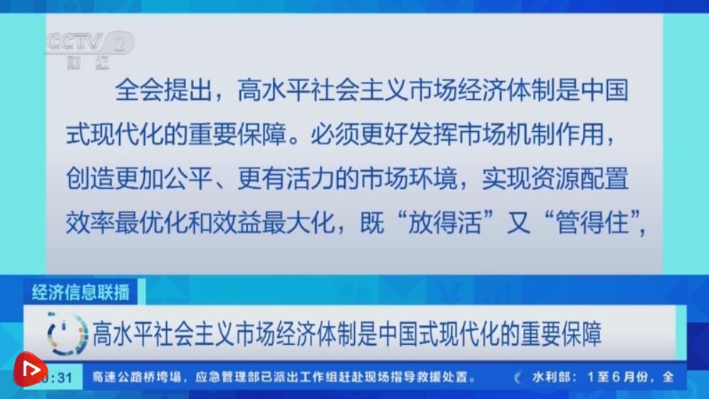全會提出,高水平社會主義市場經(jīng)濟體制是中國式現(xiàn)代化的重要保障。必須更好發(fā)揮市場機制作用,創(chuàng)造更加公平、更有活力的市場環(huán)境,實現(xiàn)資源配置效率最優(yōu)化和效益最大化,既“放得活”又“管得住”,更好維護市場秩序、彌補市場失靈,暢通國民經(jīng)濟循環(huán),激發(fā)全社會內(nèi)生動力和創(chuàng)新活力。要毫不動搖鞏固和發(fā)展公有制經(jīng)濟,毫不動搖鼓勵、支持、引導非公有制經(jīng)濟發(fā)展,保證各種所有制經(jīng)濟依法平等使用生產(chǎn)要素、公平參與市場競爭、同等受到法律保護,促進各種所有制經(jīng)濟優(yōu)勢互補、共同發(fā)展。要構(gòu)建全國統(tǒng)一大市場,完善市場經(jīng)濟基礎(chǔ)制度。