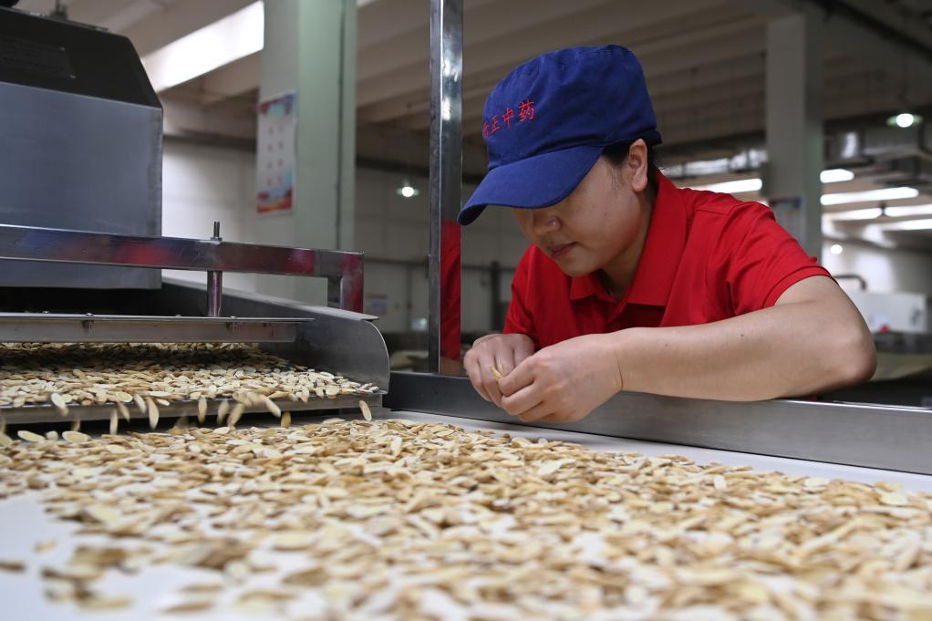在隴西縣一家藥材企業(yè),工人在中藥材切片生產(chǎn)線上忙碌(7月23日攝)。新華社記者 范培珅 攝
