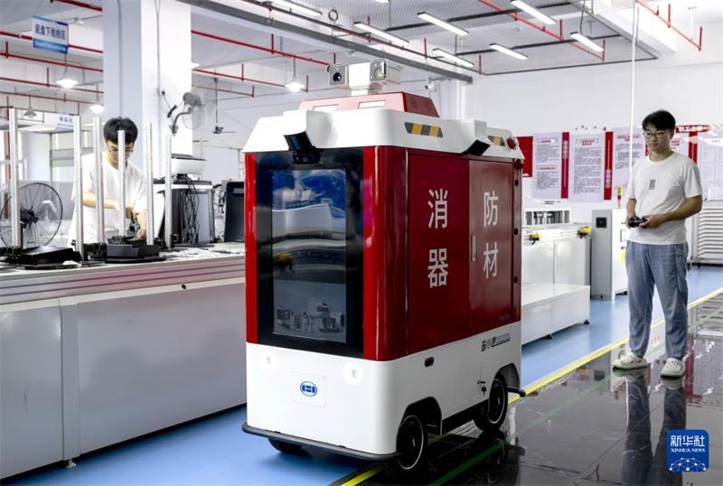 8月1日,技術(shù)人員在福建漢特云智能科技有限公司生產(chǎn)線上調(diào)試消防智能巡邏機器人。
