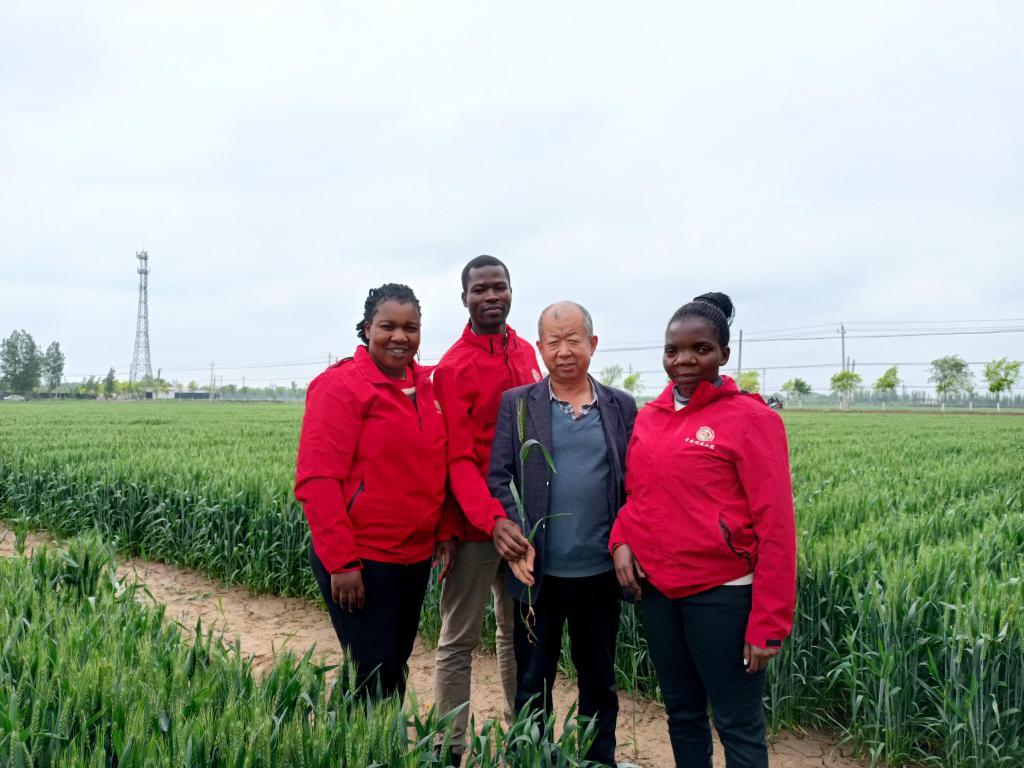 “中非科技小院”留學(xué)生庫瓦莉(左一)和同學(xué)們在位于河北曲周的農(nóng)戶試驗田和當(dāng)?shù)剞r(nóng)民學(xué)習(xí)農(nóng)業(yè)生產(chǎn)技術(shù)間隙合影(5月10日攝)。新華社發(fā)(受訪者供圖)