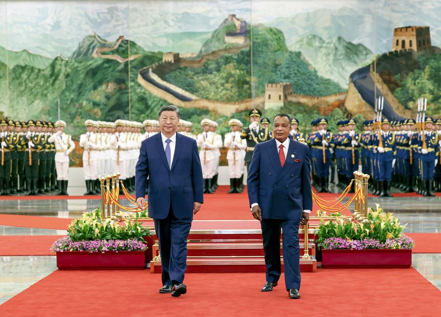 9月6日上午,國家主席習近平在北京人民大會堂同來華出席中非合作論壇北京峰會并進行國事訪問的剛果(布)總統(tǒng)薩蘇舉行會談。這是會談前,習近平在人民大會堂北大廳為薩蘇舉行歡迎儀式。