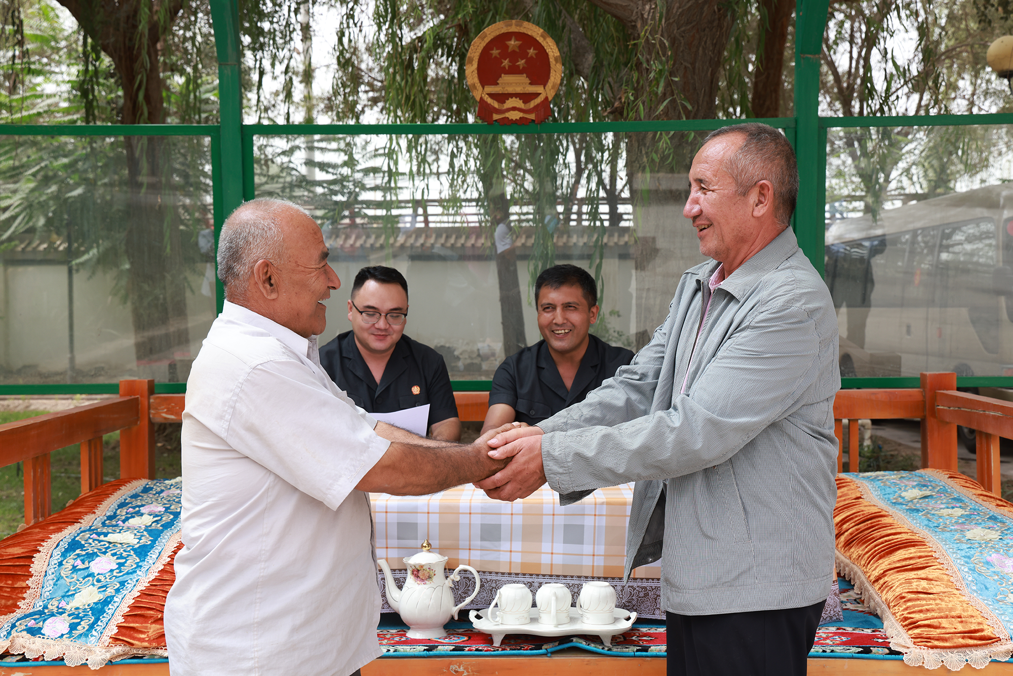 拉斯奎人民法庭收到案件后,庭長阿布都熱扎克·卡德爾將原告和被告一起叫到垂柳樹下喝茶聊天,聽他們各自訴說生活中的家長里短、困難不易。隨后,在阿布都熱扎克庭長的耐心調(diào)解下,雙方簽訂了調(diào)解協(xié)議,被告向原告支付剩余欠款中的50000元即可,但是必須于2024年10月12日前付清。帕某與沙某的友誼之舟再次向遠(yuǎn)方航行。