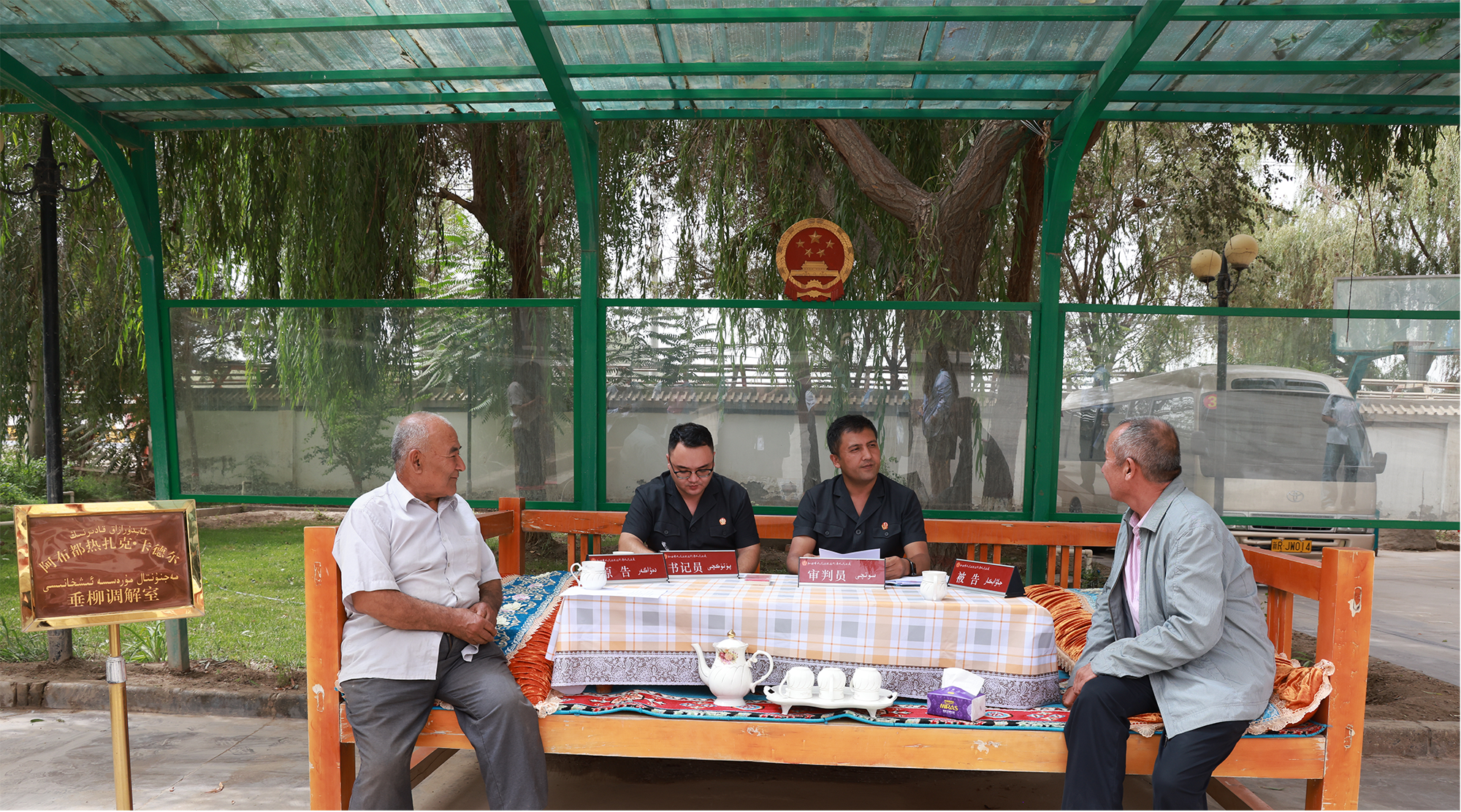 這是近日發(fā)生在新疆維吾爾自治區(qū)和田市人民法院拉斯奎人民法庭“垂柳調(diào)解室”里的一幕。