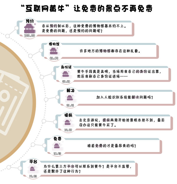 如此“作弊”手段引發(fā)輿論熱議。有網(wǎng)民表示,多地免費(fèi)景點(diǎn)都存在預(yù)約不上的現(xiàn)象,想去游玩必須花錢,其中博物館成“重災(zāi)區(qū)”;有網(wǎng)民感嘆“互聯(lián)網(wǎng)黃?!笔侄沃呙髁钊瞬坏貌环湟呀?jīng)默許了“互聯(lián)網(wǎng)黃?!爆F(xiàn)象;部分網(wǎng)民反映,某些第三方平臺(tái)上,免費(fèi)預(yù)約門票被裹上“講解服務(wù)”“研學(xué)套餐”等外衣,搖身一變成為貨架上的商品,不禁令人發(fā)問,“互聯(lián)網(wǎng)黃牛”為何可以明目張膽地在第三方平臺(tái)上售賣免費(fèi)預(yù)約門票?是官方平臺(tái)監(jiān)管不力、置之不理,還是其授意“互聯(lián)網(wǎng)黃?!迸c第三方平臺(tái)相互串通謀取利益?