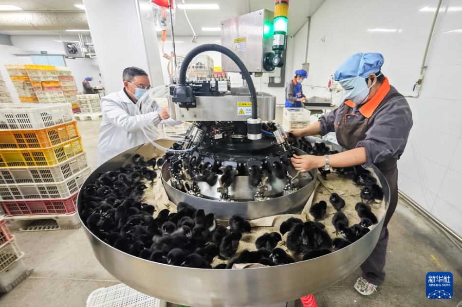 11月29日,在石門縣一家家禽加工企業(yè)雞苗處理車間,工作人員使用自動化設(shè)備給雛雞打疫苗。