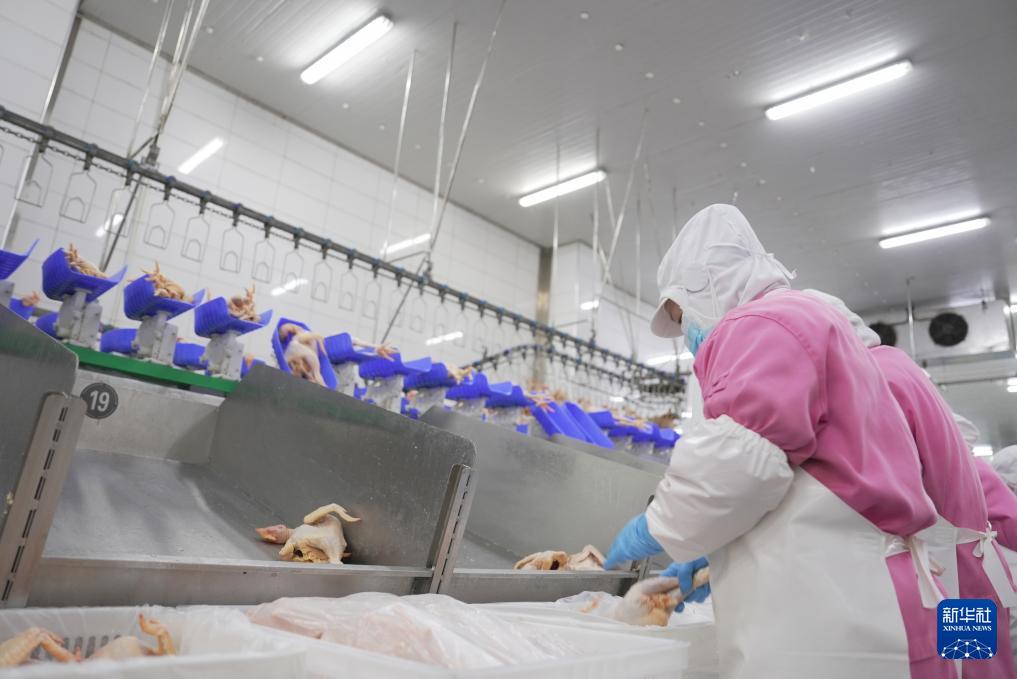 11月29日,在石門縣一家家禽加工企業(yè)冷鏈車間,工人在分裝白條雞。