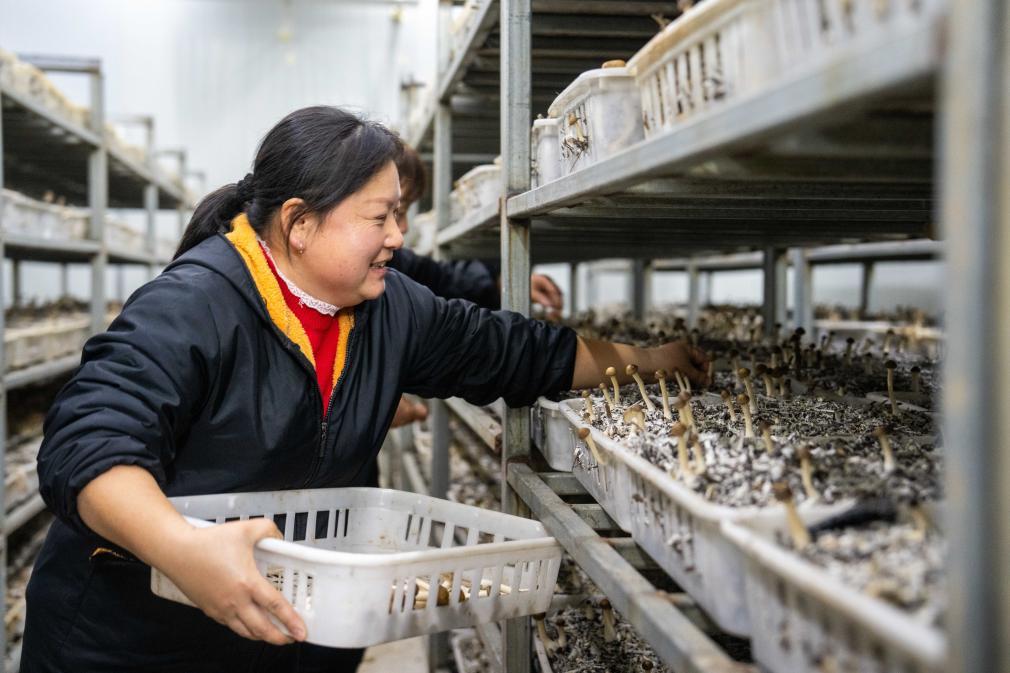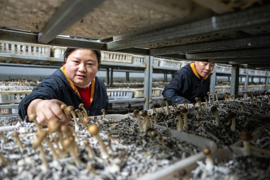 11月26日,在益陽(yáng)市資陽(yáng)區(qū)沙頭鎮(zhèn)富興村集體經(jīng)濟(jì)合作社基地,農(nóng)戶在采摘菌子。新華社記者阮周圍 攝