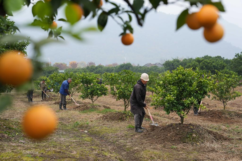 永寧江畔的橘園里,來自黃巖區(qū)頭陀鎮(zhèn)孫家匯村的村民周春國(guó)正與10多名村民一起,拿著鐵鍬等工具為橘樹施肥。