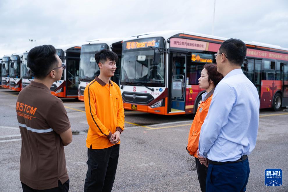 11月14日,澳巴車長(zhǎng)林宏豪(左二)與同事聊天。新華社發(fā)(張金加攝)