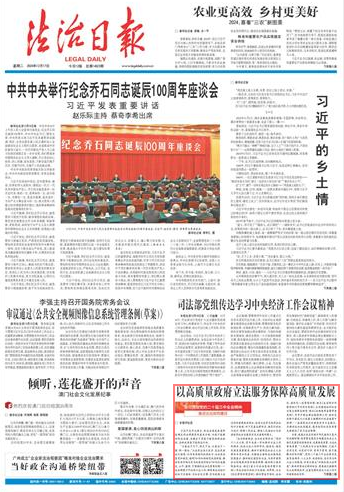 “法者,治之端也”。政府立法是法治政府建設(shè)的重要保障。我們要全面貫徹落實(shí)黨的二十大和二十屆二中、三中全會精神,完整準(zhǔn)確全面貫徹新發(fā)展理念,著眼于以良法促進(jìn)發(fā)展、保障善治,突出問題導(dǎo)向,堅(jiān)持干字當(dāng)頭,不斷提高政府立法質(zhì)量和效率,使政府立法更加“立得住”“行得通”“真管用”,推動法治政府建設(shè)取得更大進(jìn)展,努力為高質(zhì)量發(fā)展創(chuàng)造既充滿活力又安定有序的法治環(huán)境。