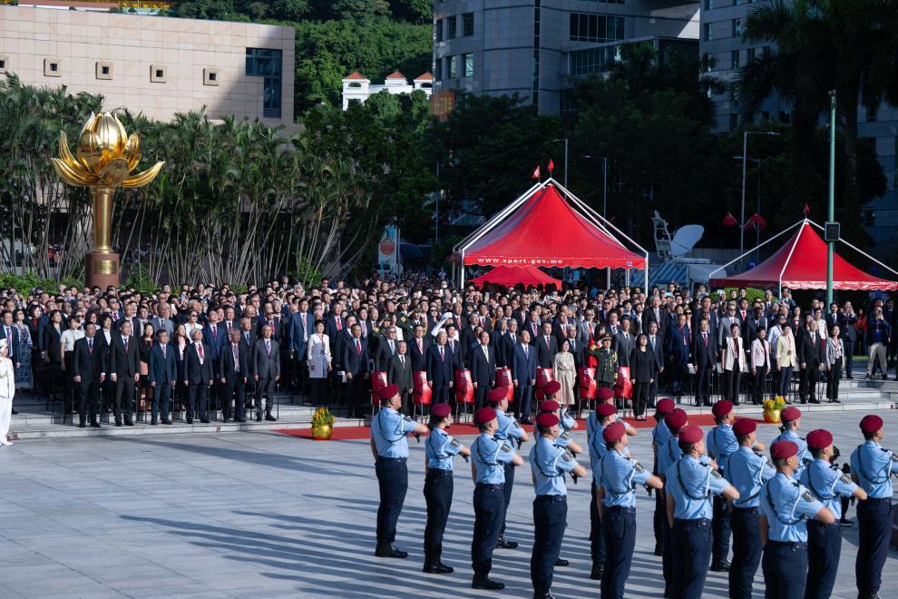 2024年10月1日,澳門特別行政區(qū)政府在金蓮花廣場(chǎng)隆重舉行升旗儀式,慶祝中華人民共和國(guó)成立75周年。新華社記者 張金加 攝