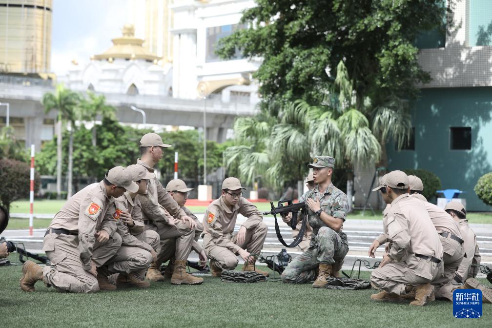2023年7月23日,第十六屆澳門青年學(xué)生軍事夏令營在駐澳門部隊開營,教官演示武器操作使用。新華社發(fā)(陳帥 攝)