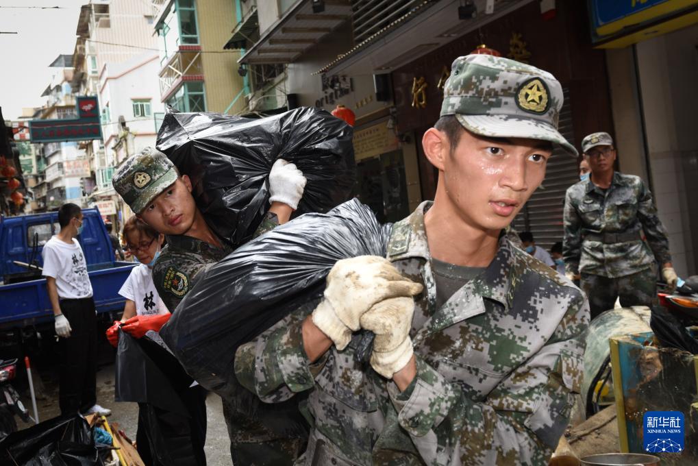 駐澳門部隊官兵參加“天鴿”臺風(fēng)救援活動(2017年8月25日攝)。新華社發(fā)(葉華敏 攝)