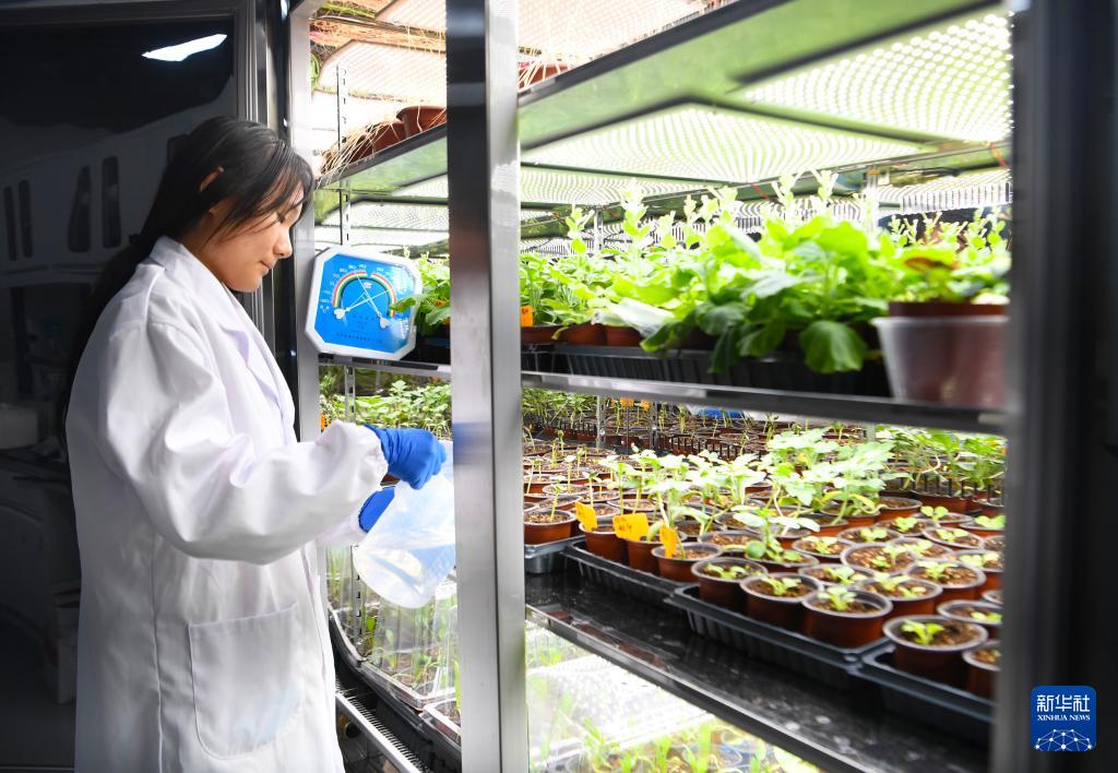 12月25日,在位于河南新鄉(xiāng)的中原農谷實驗室,中國農科院中原研究中心科研人員給植物光照培養(yǎng)箱內的樣本澆水。