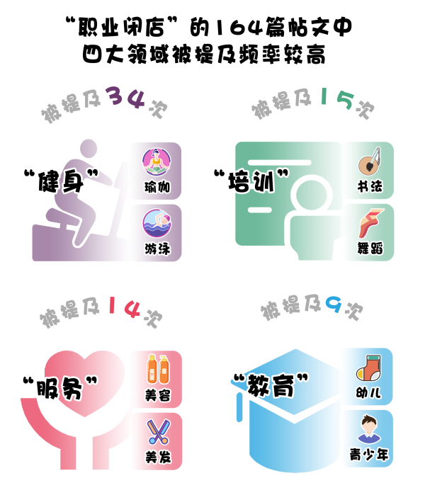 以“職業(yè)閉店”為關(guān)鍵詞,在小紅書選取164篇相關(guān)帖文,對帖文內(nèi)容進(jìn)行行業(yè)分類統(tǒng)計(jì)后發(fā)現(xiàn),“健身”“培訓(xùn)”“服務(wù)”“教育”成為消費(fèi)者吐槽頻次最高的四個(gè)預(yù)付式消費(fèi)領(lǐng)域。