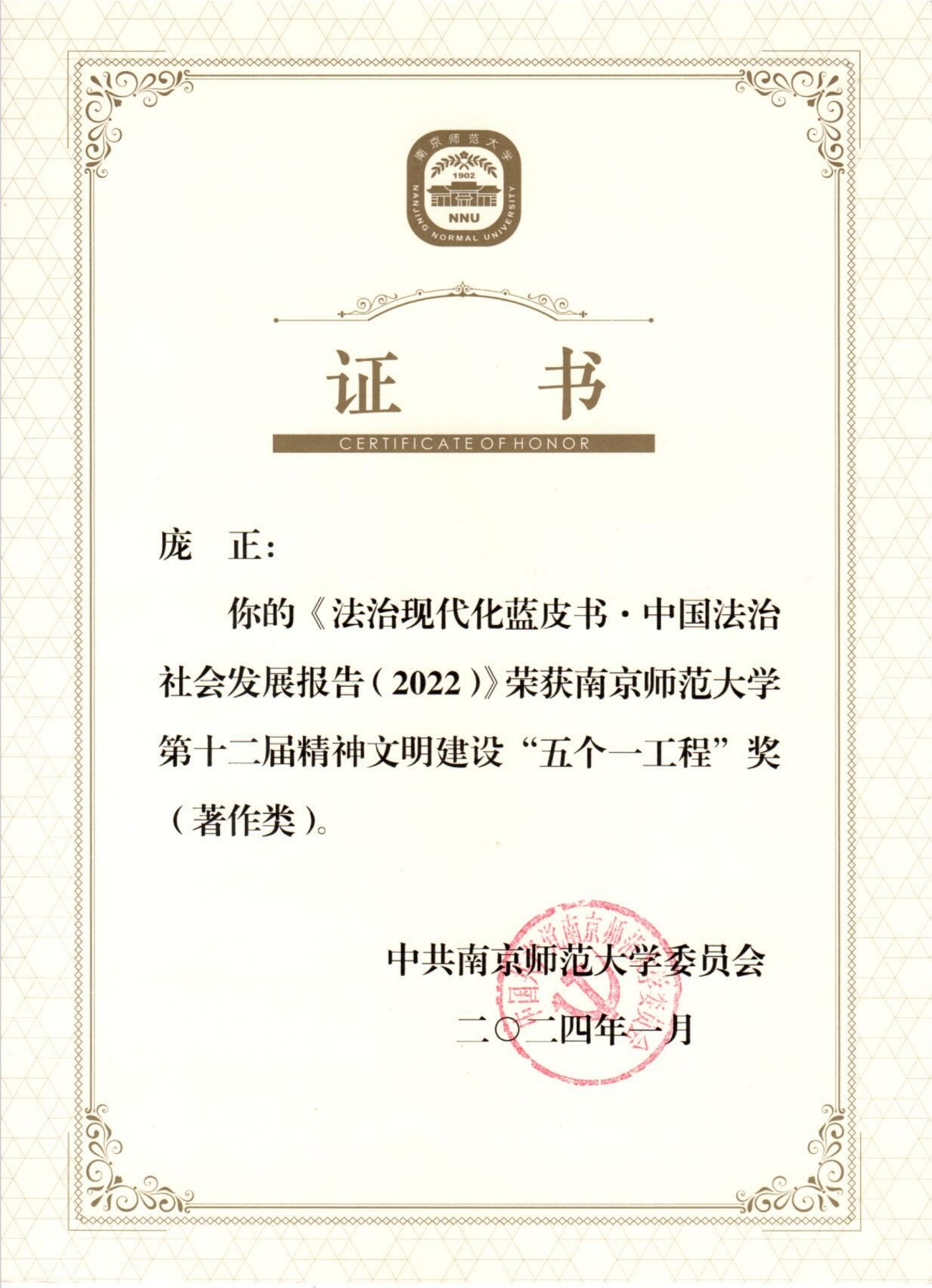 2024年1月,南京師范大學(xué)中國法治現(xiàn)代化研究院龐正研究員主持的《法治現(xiàn)代化藍(lán)皮書·中國法治社會(huì)發(fā)展報(bào)告2022》榮獲南京師范大學(xué)第十二屆精神文明建設(shè)“五個(gè)一工程”獎(jiǎng)。
