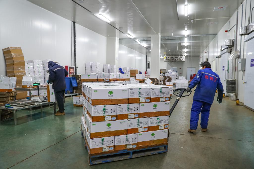 1月8日,在環(huán)縣中盛羊業(yè)加工車間,工作人員轉(zhuǎn)運(yùn)羊肉準(zhǔn)備發(fā)貨。 新華社記者郎兵兵 攝