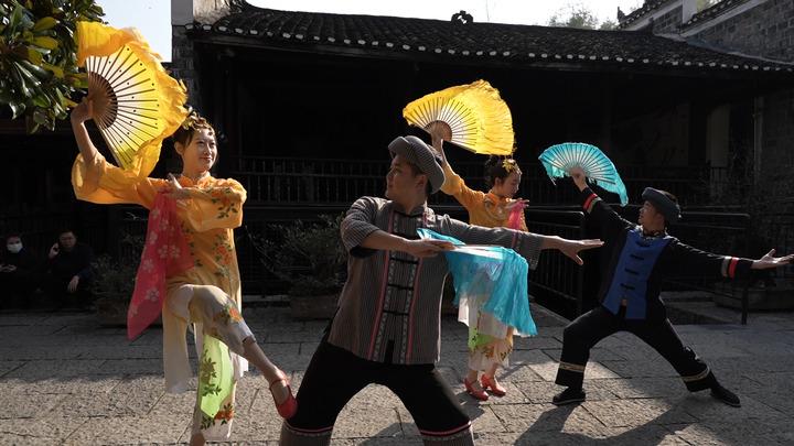 圖為1月16日秀山花燈表演者在位于重慶市秀山土家族苗族自治縣的洪安古鎮(zhèn)內(nèi)進(jìn)行表演前的排練。新華社記者 李?lèi)?ài)斌 攝