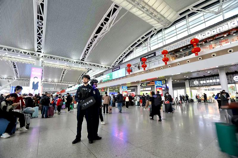 2025年春運(yùn)出行客流將于1月22起逐日迎來高峰。廣州鐵路公安處管內(nèi)廣州南站、廣州站、廣州白云站等重點(diǎn)車站也逐漸呈現(xiàn)“滿員”狀態(tài)。為確保旅客群眾平安順利乘車,廣州鐵路警方針對(duì)拉客擾序、盜竊詐騙等重點(diǎn)治安問題,多措并舉持續(xù)嚴(yán)厲打擊,全力營(yíng)造出行良好環(huán)境。