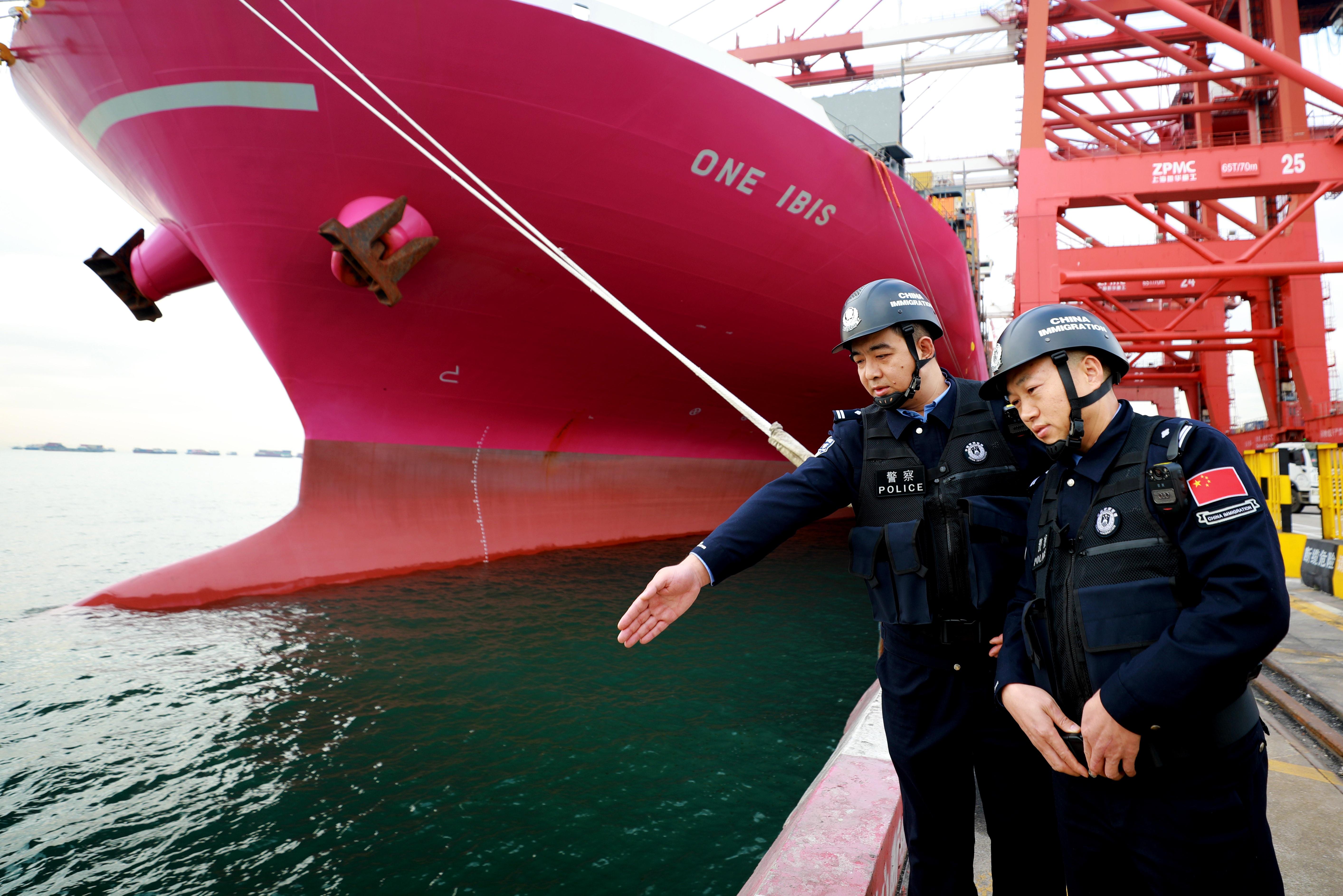 幾十米高的舷梯倚著船體,身著救生衣的劉洪洲雙手緊握欄桿,小心翼翼地一步步登上舷梯,到達(dá)船艙。今天是一名中國(guó)籍船東要下船,人證對(duì)照無誤后,劉洪洲仔細(xì)檢查行李箱內(nèi)物品,全部核查沒有問題后,登記放行。