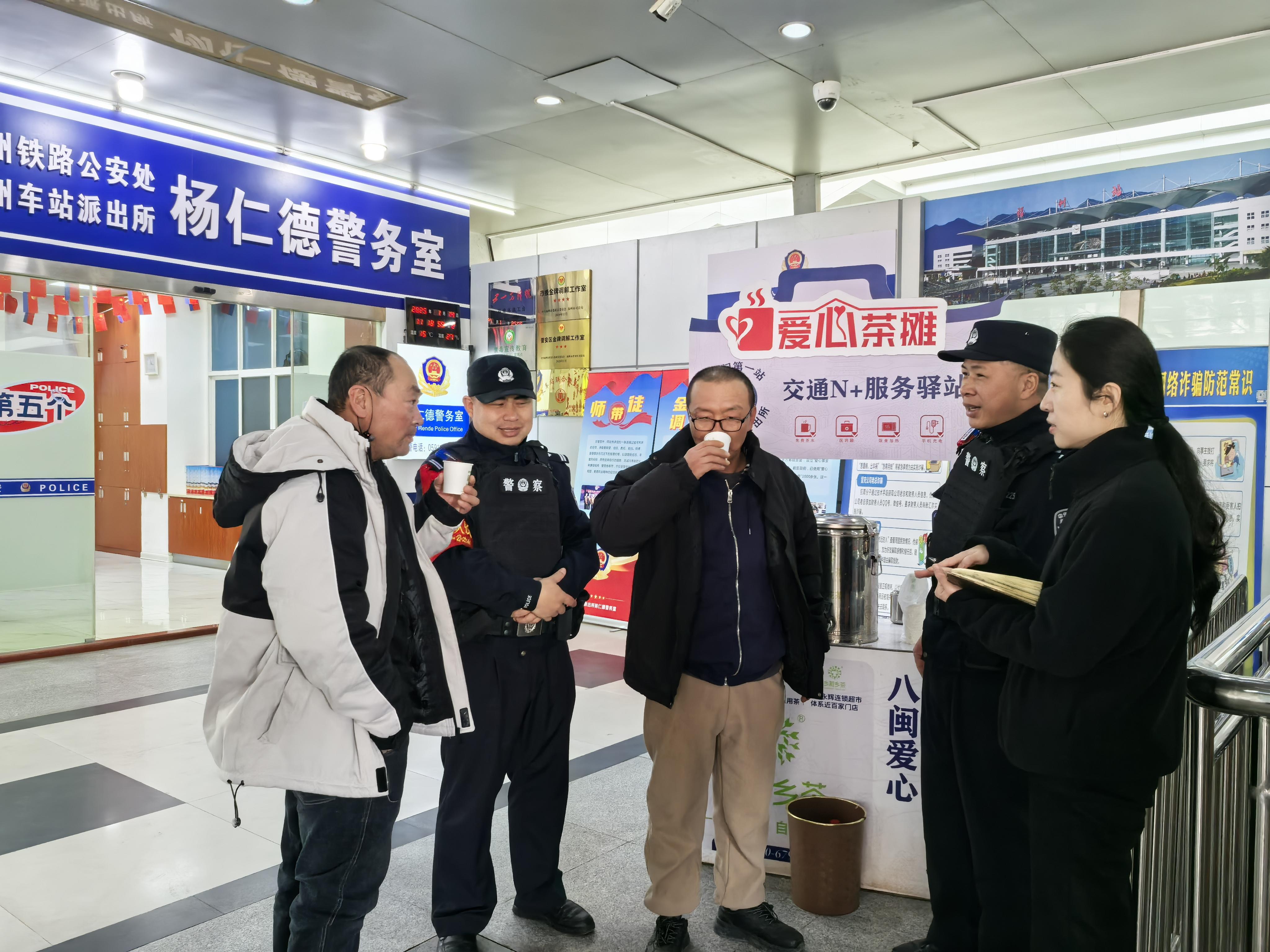 1月14日上午,在“楊仁德警務(wù)室”的“愛心茶攤”前,呂欽(左二)在師父楊仁德(右二)指導(dǎo)下高效解決了一起返鄉(xiāng)旅客求助。旅客們喝著熱茶,向記者(右一)稱贊福州鐵路公安的暖心服務(wù)。 本報通訊員 劉曉彬 攝