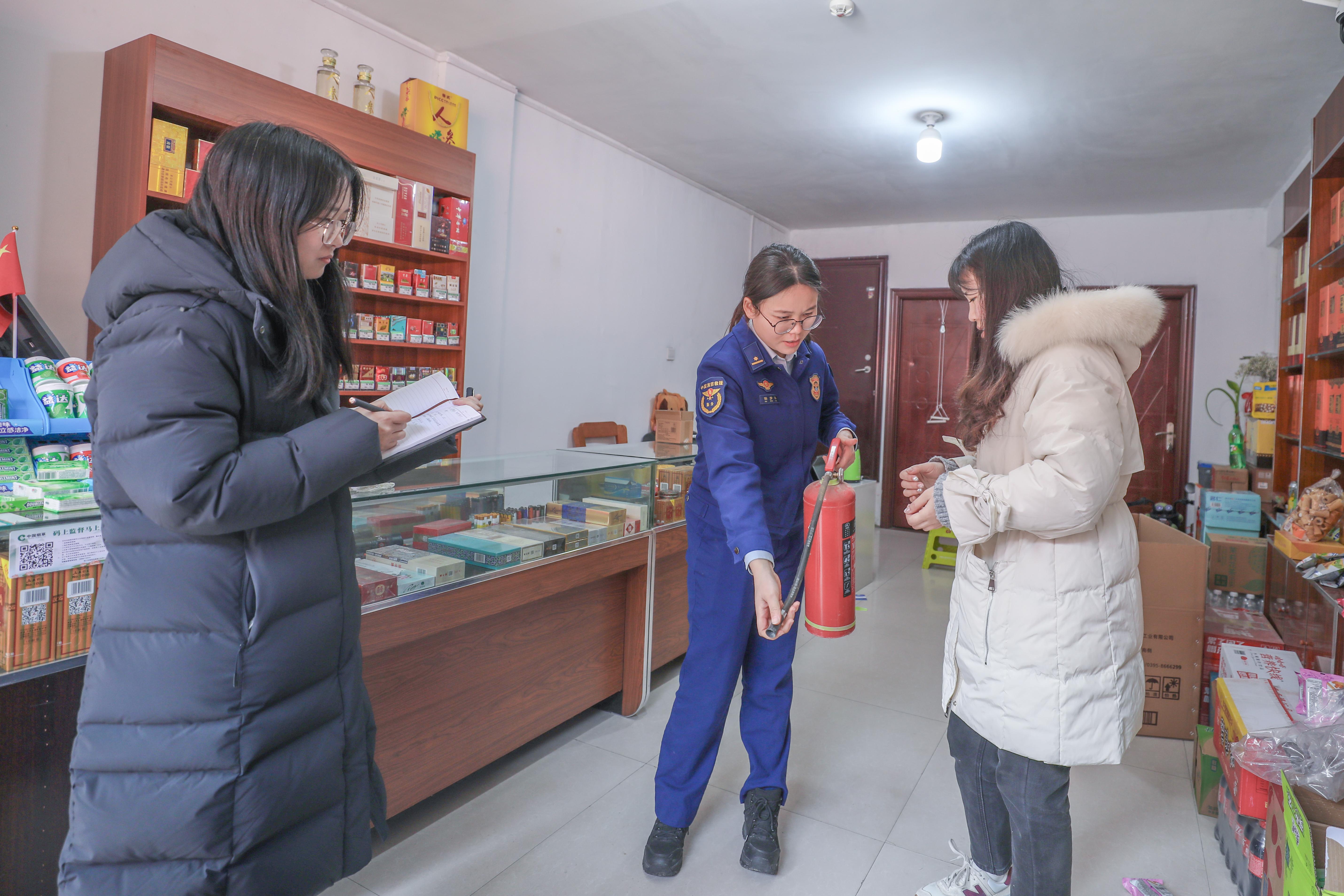 圖為川匯區(qū)消防救援大隊(duì)初級(jí)專業(yè)技術(shù)職務(wù)侯夢(mèng)華(左二)在關(guān)帝廟歷史文化街區(qū)向商戶宣傳消防安全知識(shí)及滅火器正確使用方式,記者(左一)在現(xiàn)場(chǎng)采訪。法治日?qǐng)?bào)通訊員 鄧碩宇 攝