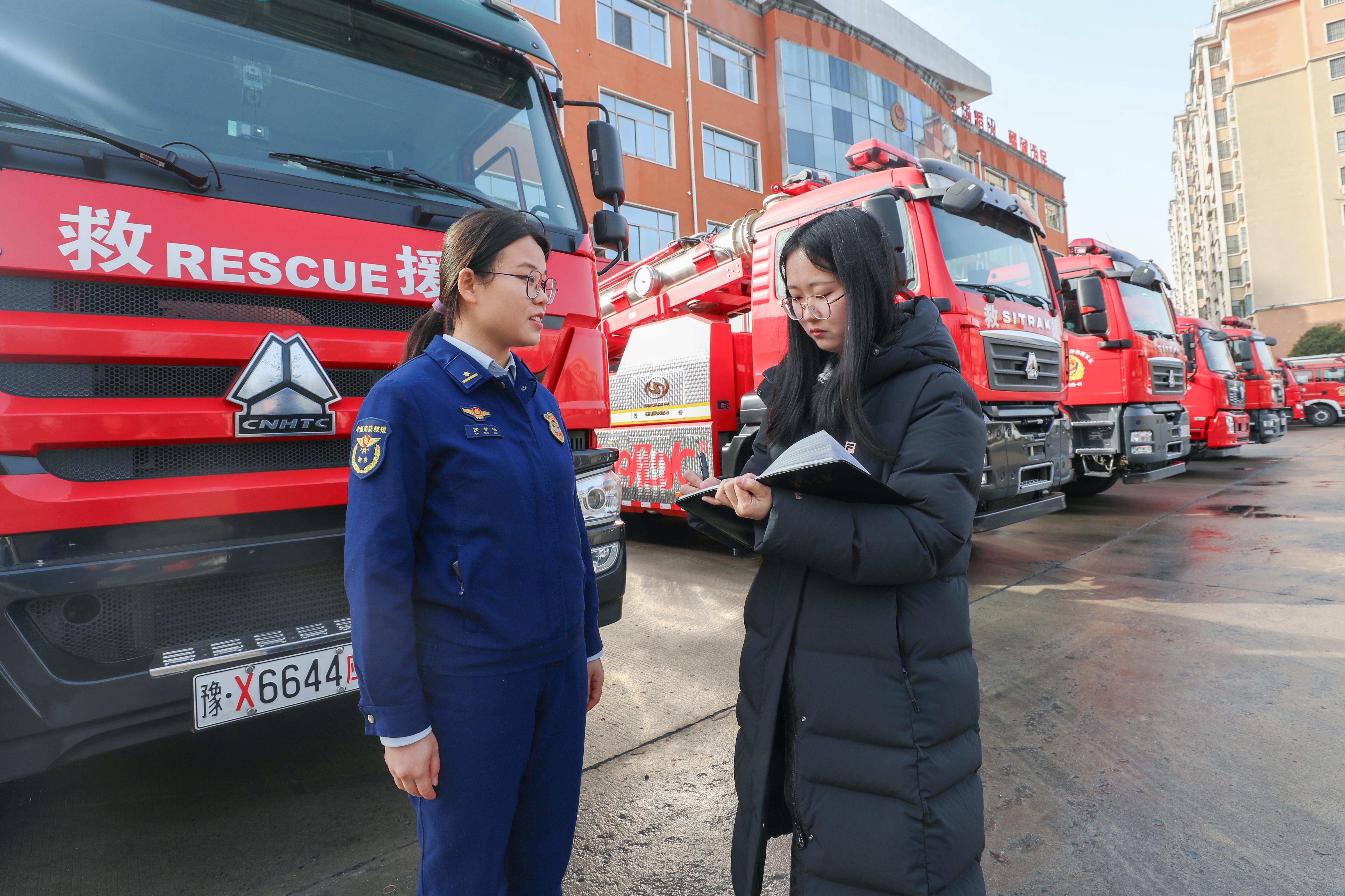 圖為川匯區(qū)消防救援大隊(duì)初級(jí)專業(yè)技術(shù)職務(wù)侯夢(mèng)華(左)向記者介紹川匯區(qū)消防救援大隊(duì)有關(guān)情況。法治日?qǐng)?bào)通訊員 鄧碩宇 攝