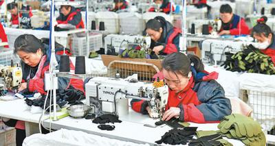 山東嘉祥縣,工作人員在濟(jì)寧全成手套有限公司生產(chǎn)車(chē)間縫制滑雪手套。