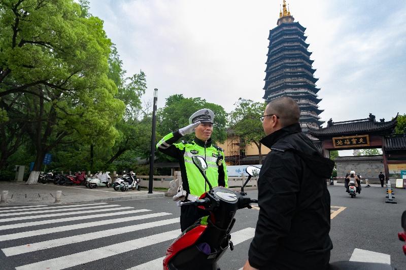 雖然戴著手套,但握著車把的粗礪手掌還是凍出了些裂口,稍微扯一扯就生疼。這是任傳棟參加常州天寧寶塔聽鐘聲迎新年安保任務(wù)的第十五個(gè)年頭,2009年工作后,每一個(gè)大年夜他都守在天寧寶塔邊的紅梅路上,15年來(lái)從不間斷。大年夜登天寧寶塔撞鐘祈福賞燈,已經(jīng)成了很多常州市民的“新年俗”,在紛至沓來(lái)卻秩序井然的車流人海背后,是常州交警數(shù)十年如一日?qǐng)?jiān)守崗位的守護(hù)。