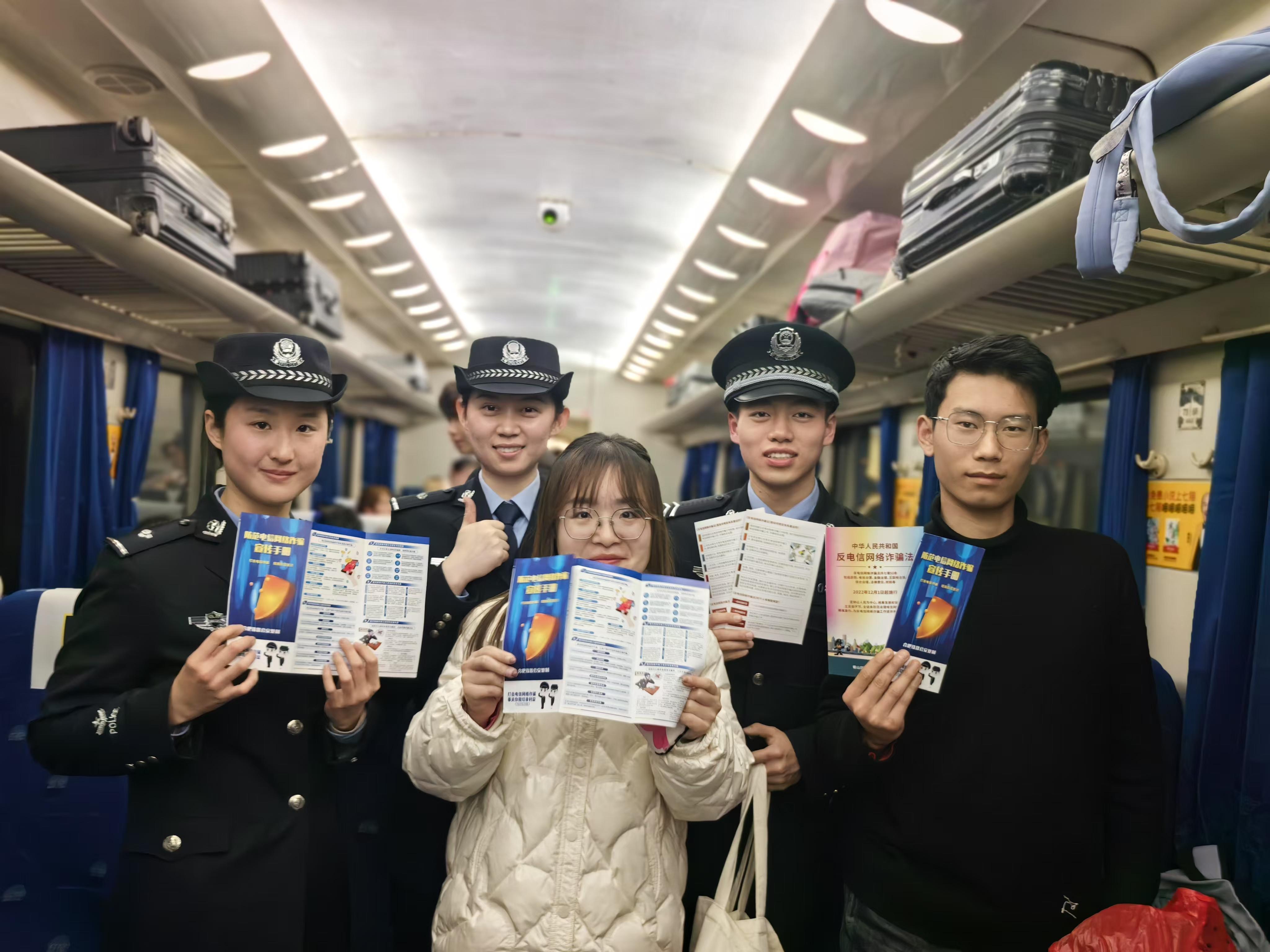 圖為民警與旅客手舉防范電信網(wǎng)絡(luò)詐騙宣傳手冊合影留念。
