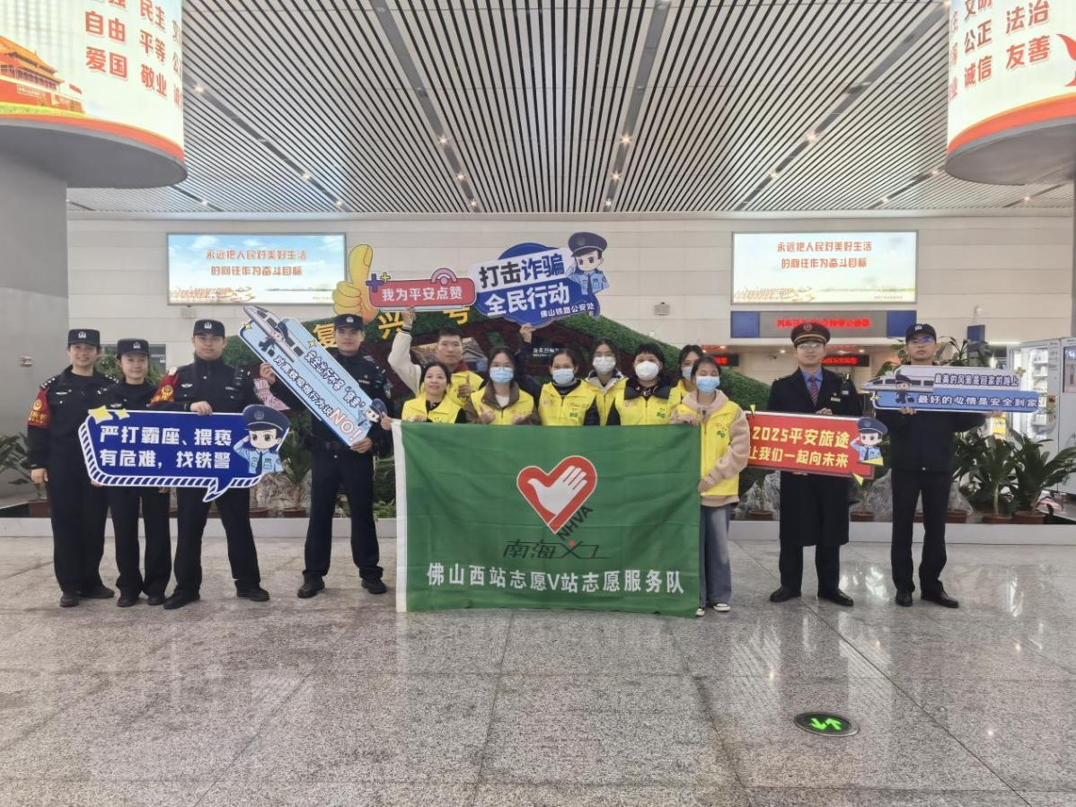 圖為佛山西站志愿V站志愿服務(wù)隊與執(zhí)勤民警的合影。通訊員 鄒轢瓊 攝