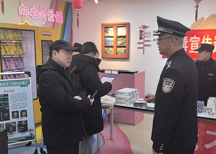 圖為《法治日報》記者(右三)在青島汽車東站采訪派出所所長王臻(著警察制服者)