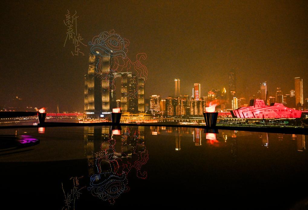圖為在重慶拍攝的無(wú)人機(jī)表演。春節(jié)期間,多場(chǎng)無(wú)人機(jī)表演在重慶朝天門(mén)長(zhǎng)江、嘉陵江兩江交匯處精彩上演。新華社記者 王全超 攝