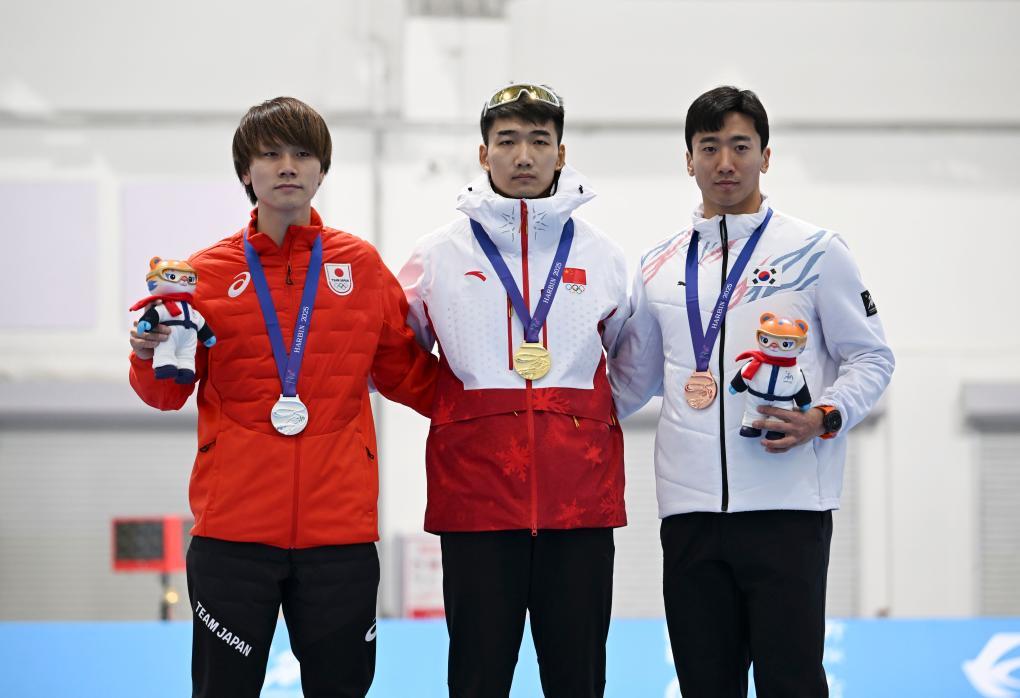 2月10日,冠軍中國選手高亭宇(中)、亞軍日本選手森重航(左)和季軍韓國選手金俊昊在頒獎儀式上。新華社記者 王曦 攝
