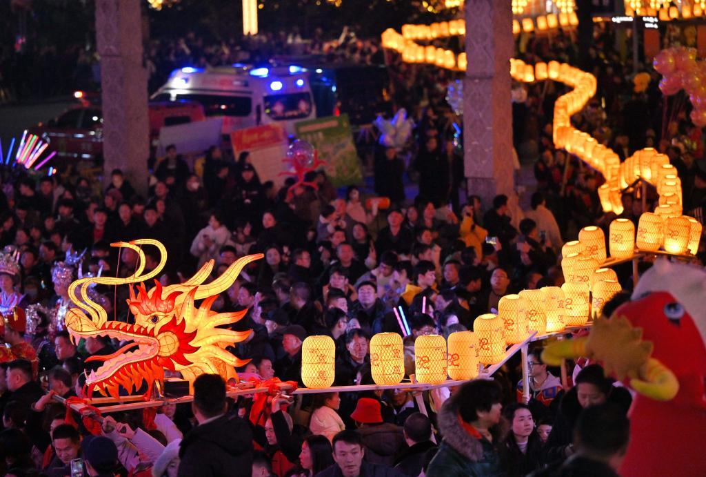 2月10日晚,在湖北省宣恩縣城興隆老街,百米板凳龍?jiān)谌巳褐杏涡小P氯A社發(fā)(宋文攝)