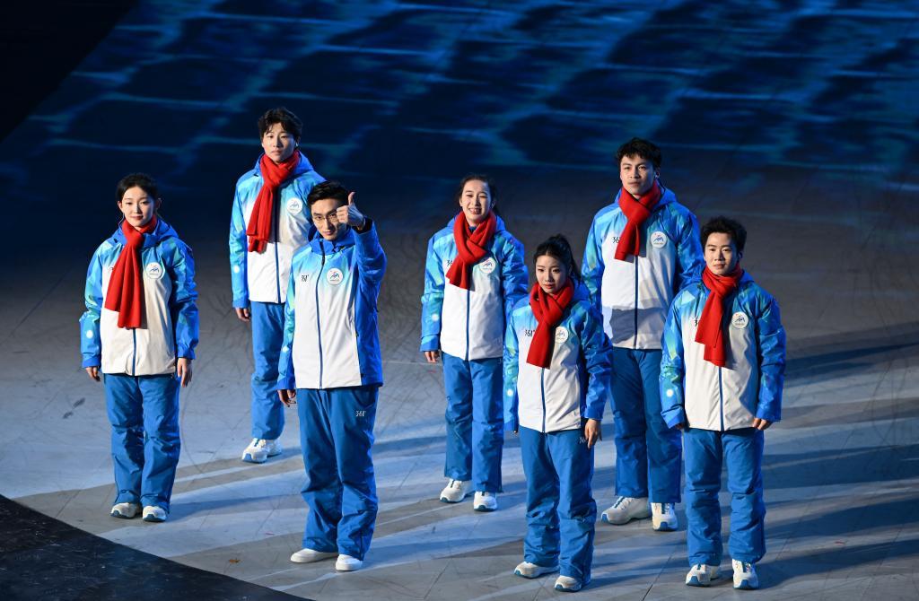 冰雪同夢,亞洲同心。在激昂的樂曲聲中,各參賽代表團的旗幟入場,運動員歡聚一堂,迎接屬于他們的歡慶時刻。這一刻,艱辛不再,無謂成敗,人們對著鏡頭盡情歡呼,圍著吉祥物“濱濱”“妮妮”跳起圓圈舞,滿場的歡騰長達(dá)十多分鐘。待運動員離場,舞臺上亮出一朵如花似雪的同心結(jié)。