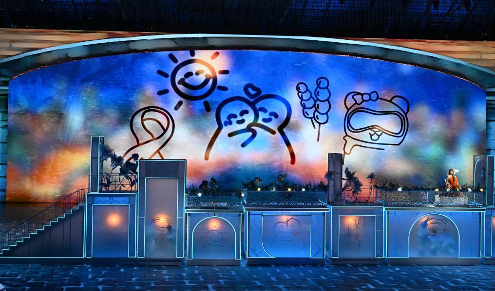 舞臺上,當(dāng)現(xiàn)場舞者與虛擬樂團交相呼應(yīng),閉幕式演出震撼開場。身穿橘黃紗裙的舞者翩然,宛如冰凌花朵朵綻放??蓯鄣摹把┤恕蔽鑴尤珗觯路鹧┥降木`帶來捷報。
